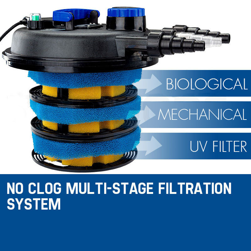 - STAGE 1 - MECHANICAL FILTRATION - Water is pumped into the filter (pump sold separately) to create the necessary pressure to begin the mechanical filtration stage. Three foam discs collect various sizes of unwanted organic debris encouraging the growth of large numbers of beneficial bacteria which break down harmful pollutants.