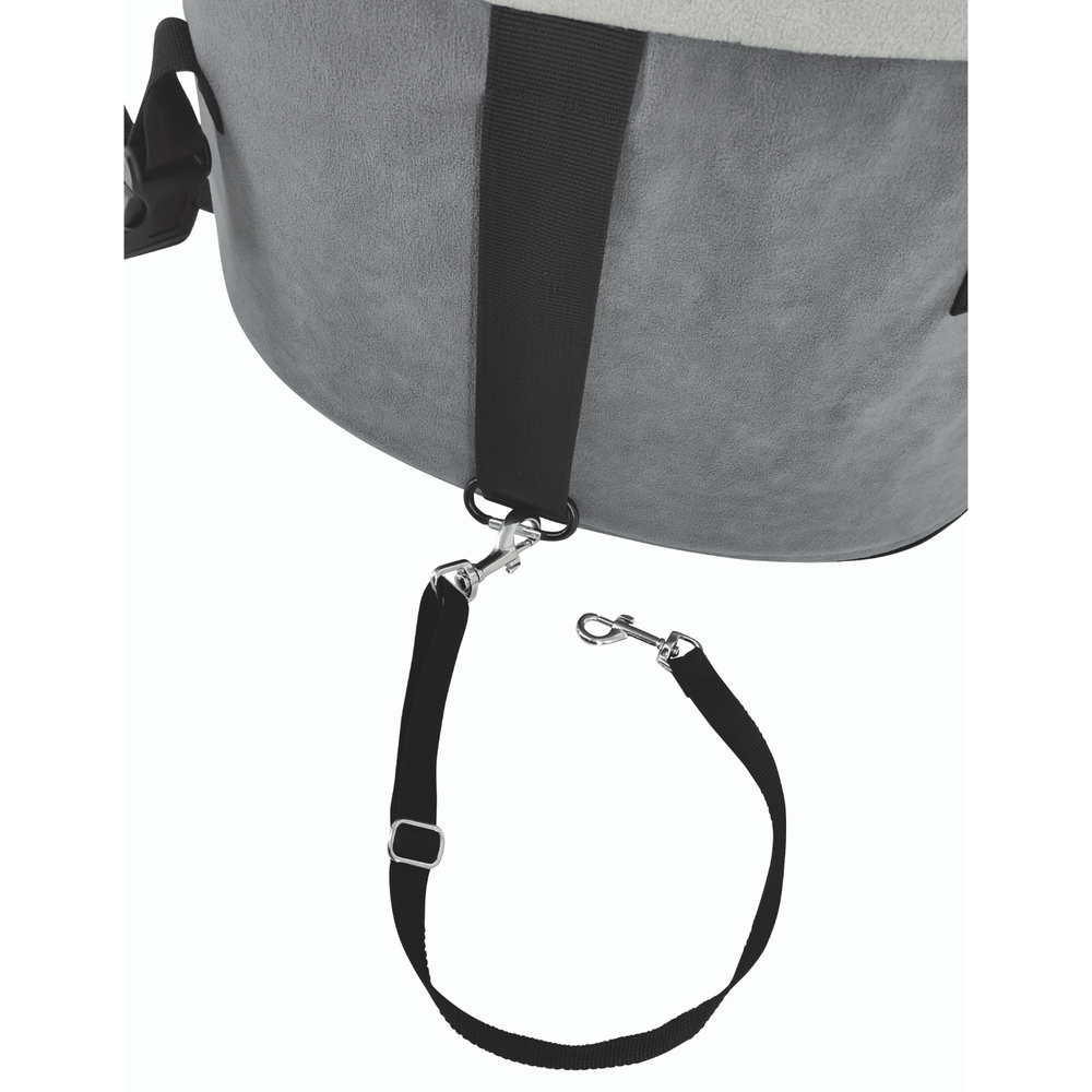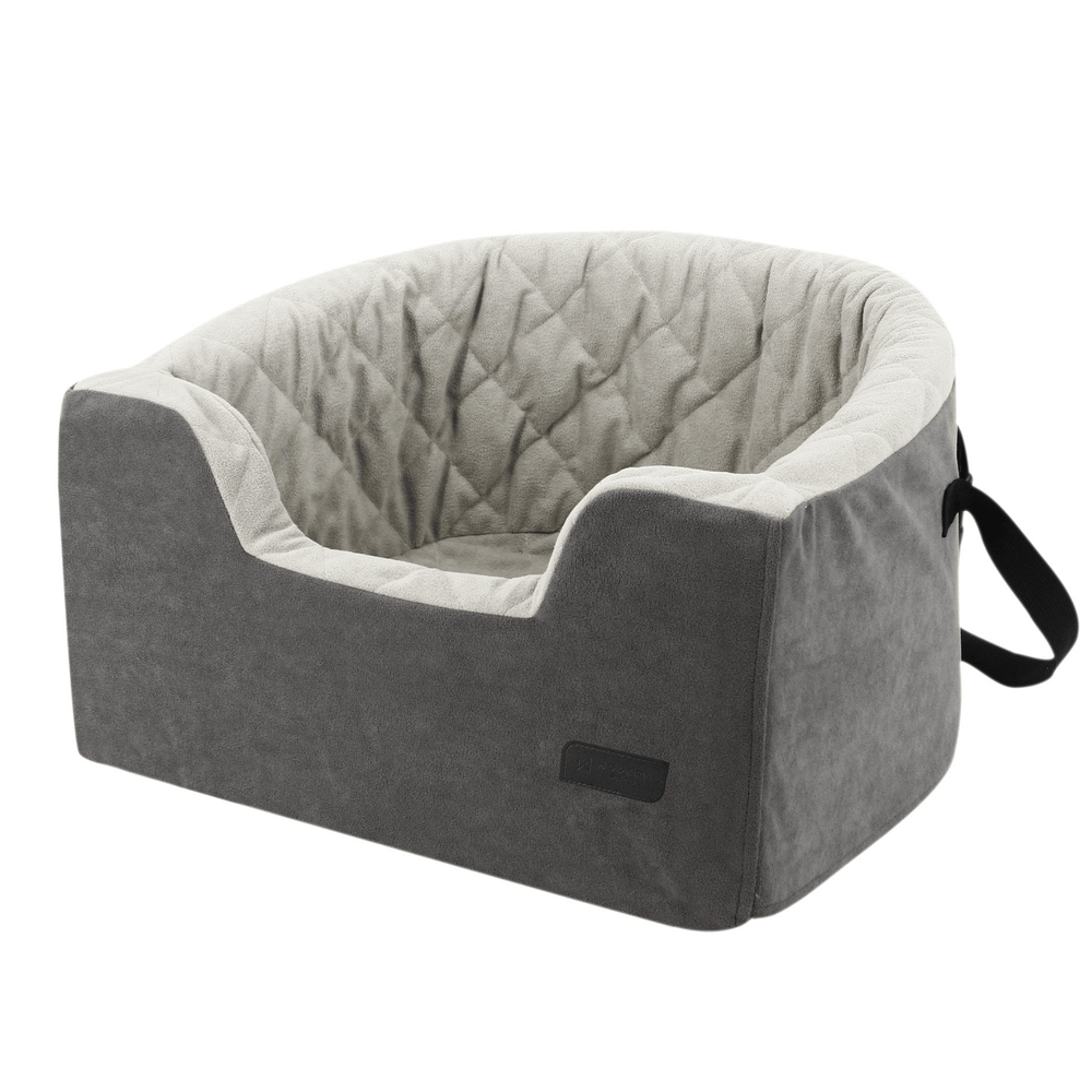 Grey in colour and made from polyester, this canine booster seat is a staple for any small dog owner. Padded with thick foam, it comes with a removable cover and non-slip bottom. It also boasts two sets of tethers. The first hooks into your pup's collar to keep them from jumping out while the vehicle's in motion.