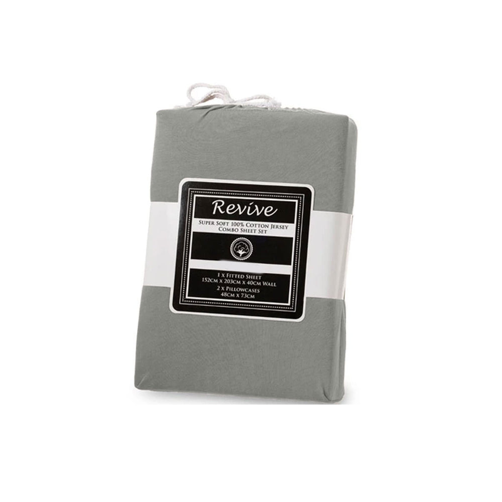 Revive Silver 100% Cotton Jersey Super Soft Fitted Sheet Combo Set King Single 35cm Wall