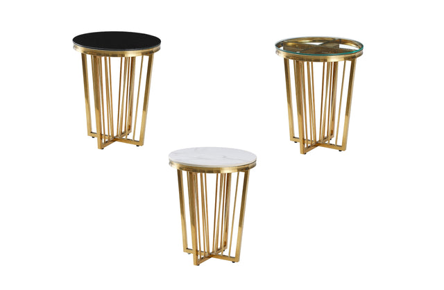 Add a touch of elegance to your living room or bedroom with the Salina Side Table in gold. This versatile piece of furniture is available in a polished steel gold frame with a tempered glass top.