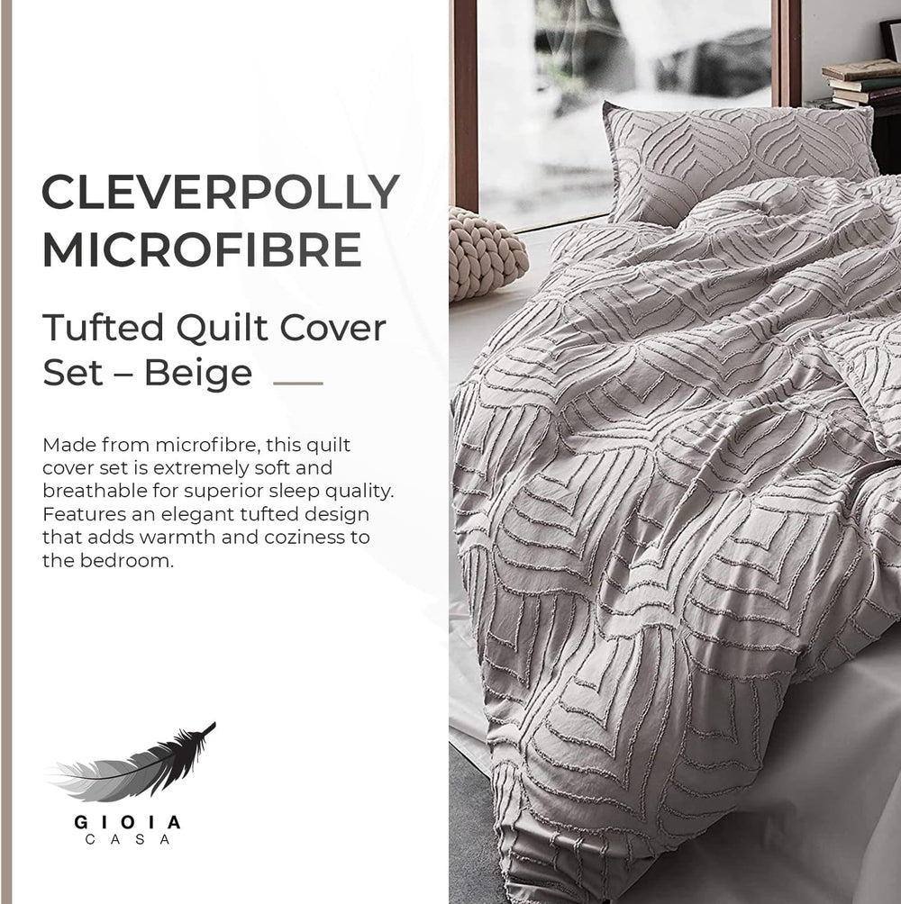 100% Premium Tufted Microfibre Quilt Cover Set - Ultra-Soft, Durable Embroidery Bedding Comforter Set - Machine Washable & Zipper Closure - Beige - Super King