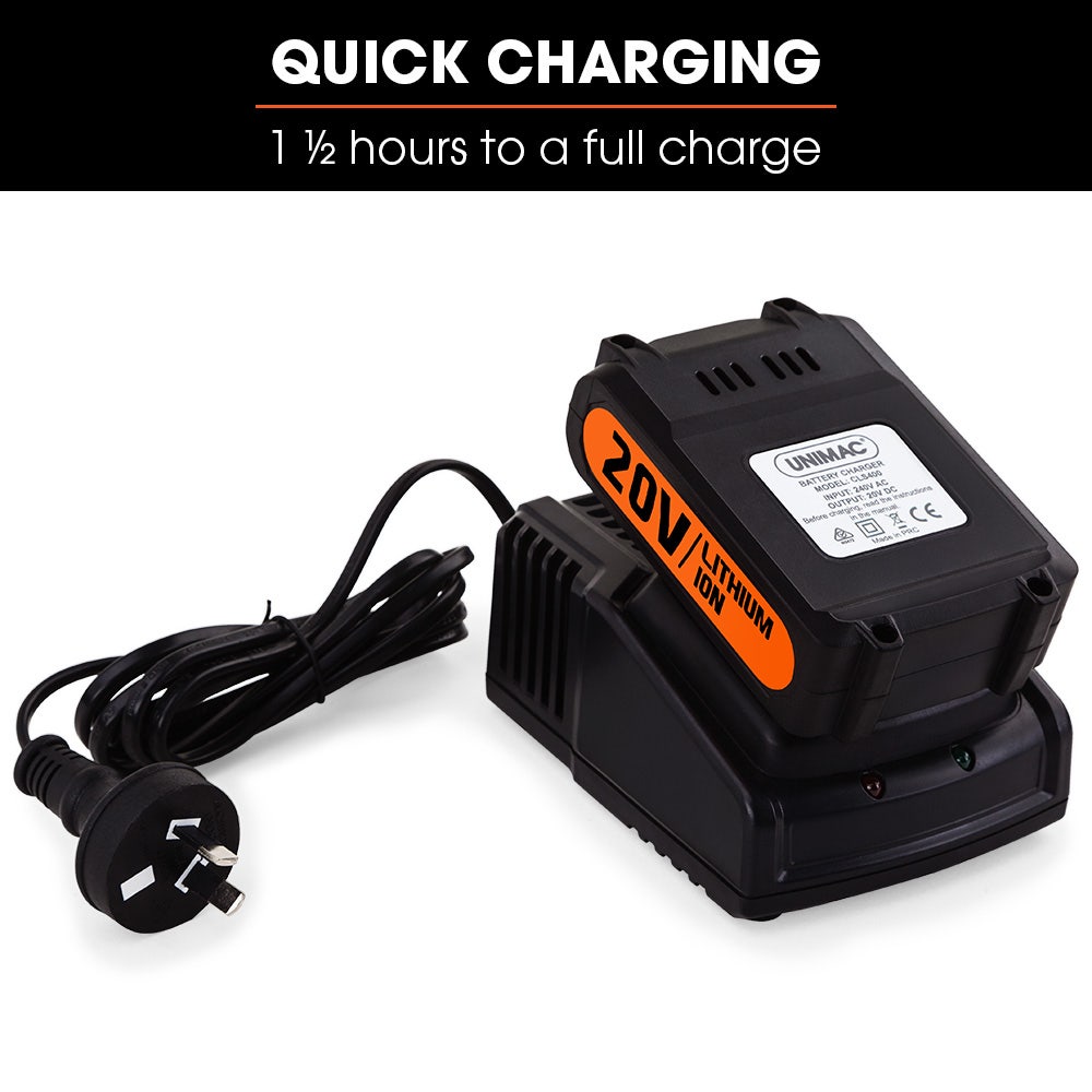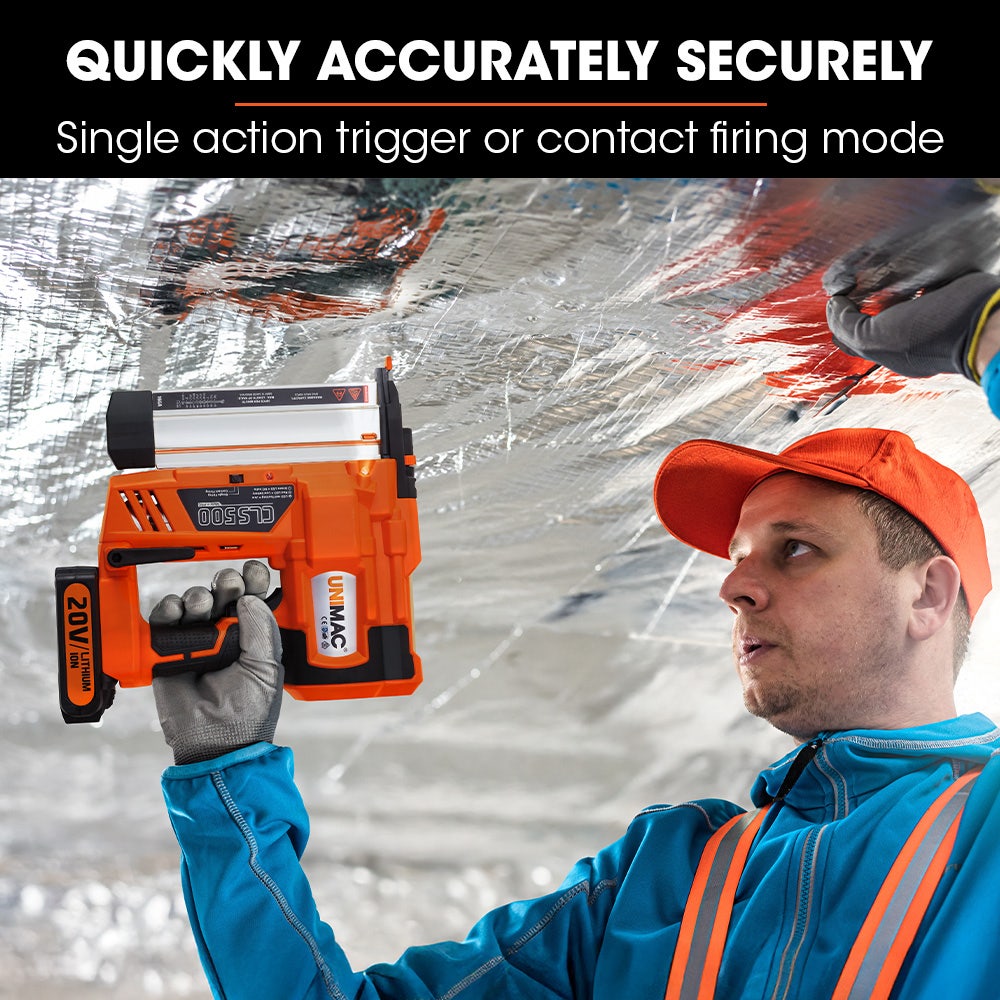 This package comes with a BONUS carry case, 20V lithium battery, charger, spare No-Mar contact tip, 200 brad nails and 200 staples so you can get to work straight away. This is without a doubt one of Unimac's most advanced power tools on the market. So why wait? Take the difficulty and fatigue away from your carpentry projects and order your new Unimac CLS500 20V Lithium-ion 2-in-1 Brad Nailer and Stapler today!