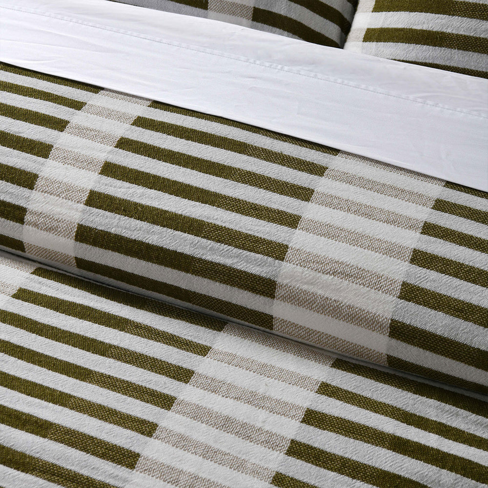 The Vintage Design Homewares Tempo Green Cotton Jacquard Quilt Cover Set features a yarn dyed contemporary stripe design woven from cotton. The jacquard cotton weave gives not only a textural look, but blends soft comfort and strength that will enhance your Sleeping Space. The bold linear stripes in fresh green, olive, and taupe tones strikes the perfect balance between contemporary and cosy. This set offers a textured finish that feels luxurious to the touch, ideal for creating a stylish, inviting retreat with personality and charm.