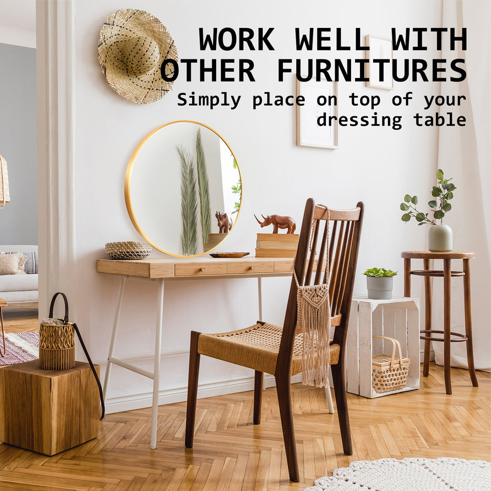 The round mirror is modern and clean in design and comes with a 3.9cm thickness minimalistic aluminum frame that is sure to capture the attention of all. Plus, its curved lines all around will become a central focal point in any room which makes spaces feel more inviting and relaxing.